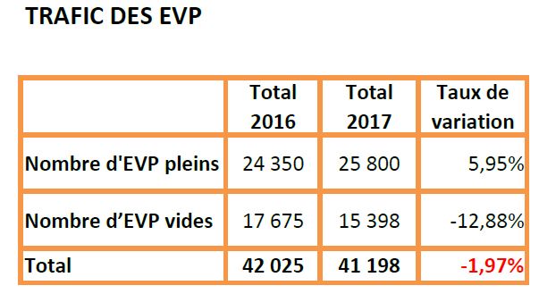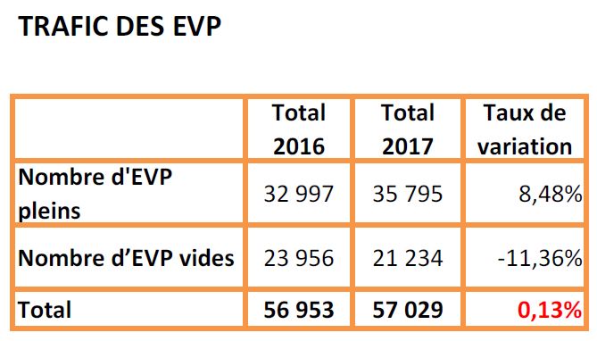 Le trafic des EVP est de 57029 unités, dont 35795 EVP pleins, en augmentation de 0,13% par rapport à l’année précédente.