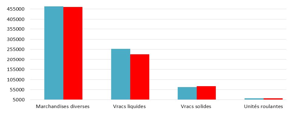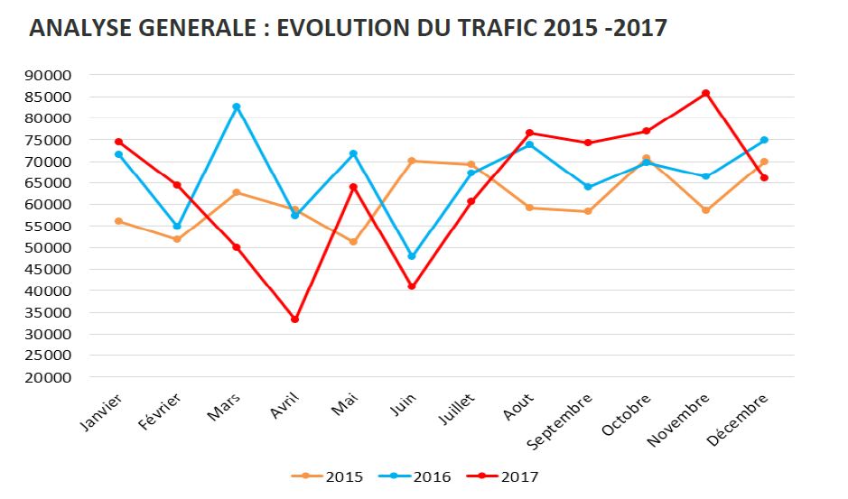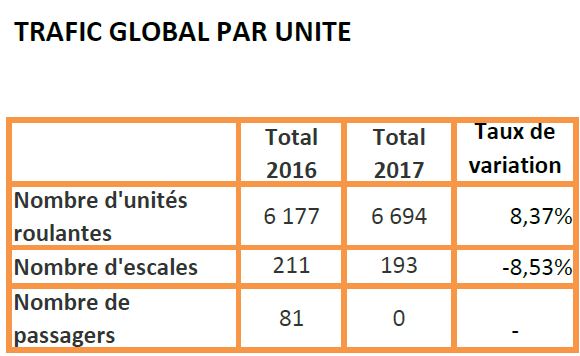 Le trafic global (import/export) s’élève à 779 720 tonnes, soit une baisse de 3,15% par rapport à l’année 2016. Cette baisse est portée par le recul de près de 11% du trafic de vracs liquides (hydrocarbures,…). Elle s’explique aussi par le trafic conteneurisé qui se maintient à – 0,48%, au lieu de poursuivre sa croissance à deux chiffres comme l’an dernier (+11,9% en 2016 par rapport à 2015).